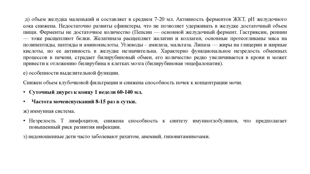 д) объем желудка маленький и составляет в среднем 7-20 мл. Активность ферментов ЖКТ, рН желудочногосока снижена. Недостаточно развиты сфинктеры, что не позволяет удерживать в желудке достаточный объем