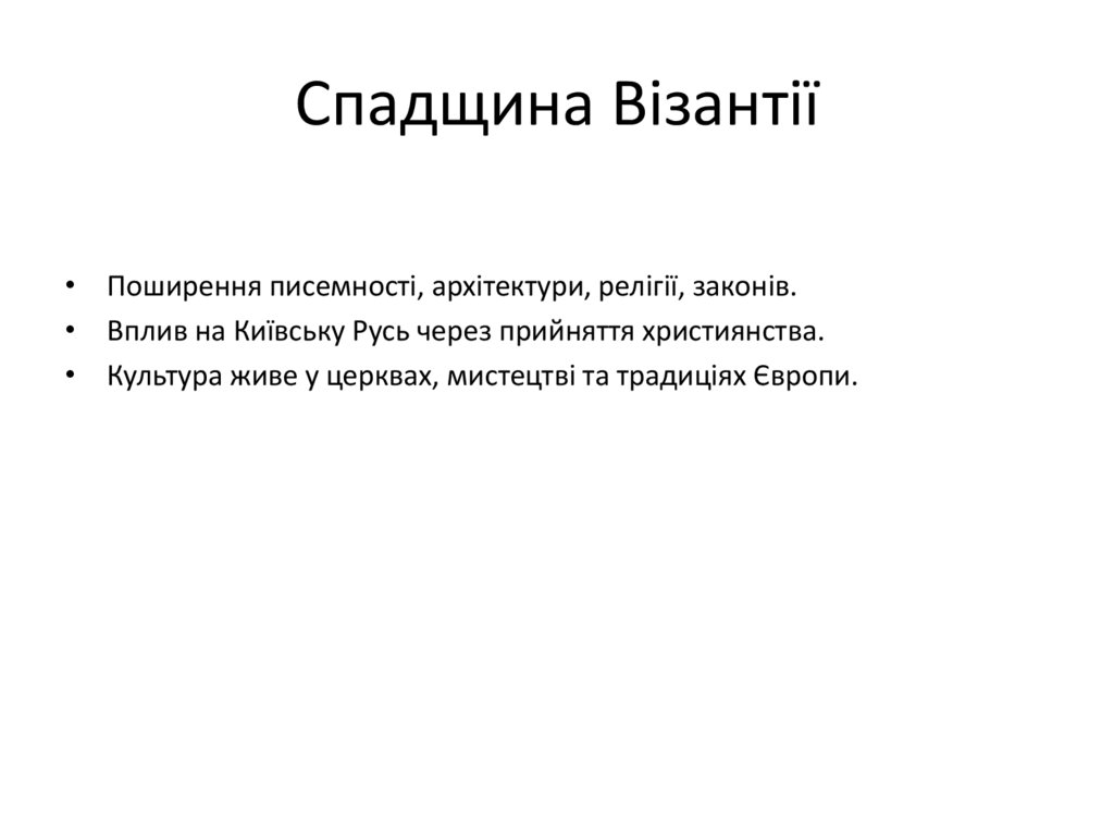 Спадщина Візантії• Поширення писемності, архітектури, релігії, законів.