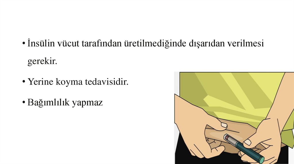 • İnsülin vücut tarafından üretilmediğinde dışarıdan verilmesigerekir.