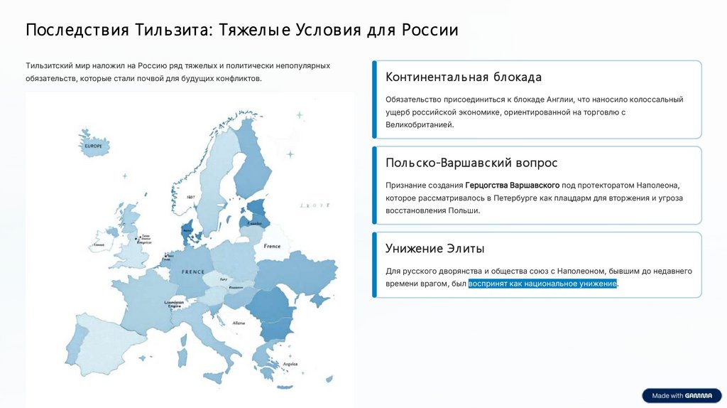 Посл едств ия Тил ь зита: Тяжел ы е Усл ов ия дл я РоссииТильзитский мир наложил на Россию ряд тяжелых и политически непопулярных