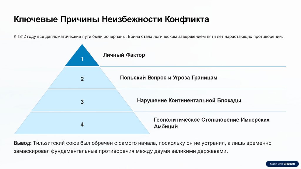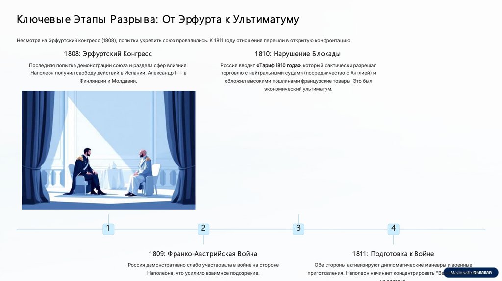 Кл ючев ы е Этапы Разры ва: От Эрфурта к Ул ьтимат умуНесмотря на Эрфуртский конгресс (1808), попытки укрепить союз провалились. К 1811 году отношения перешли в открытую конфронтацию.