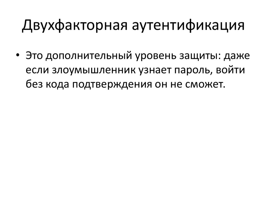 Двухфакторная аутентификация• Это дополнительный уровень защиты: даже