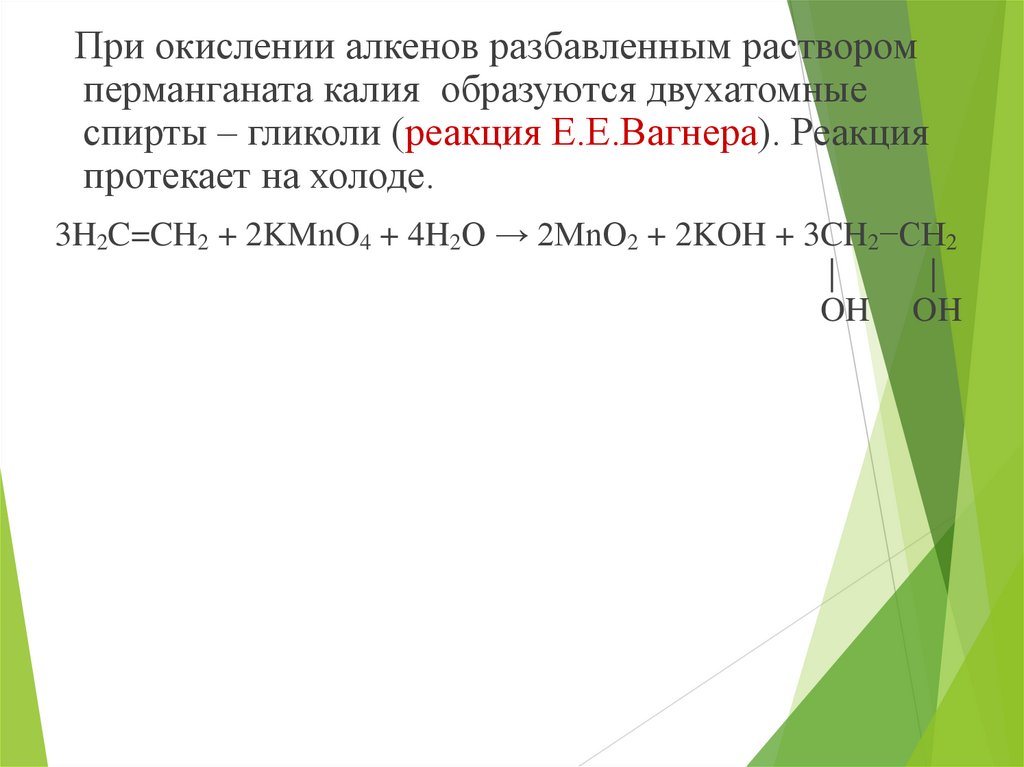 При окислении алкенов разбавленным растворомперманганата калия образуются двухатомные