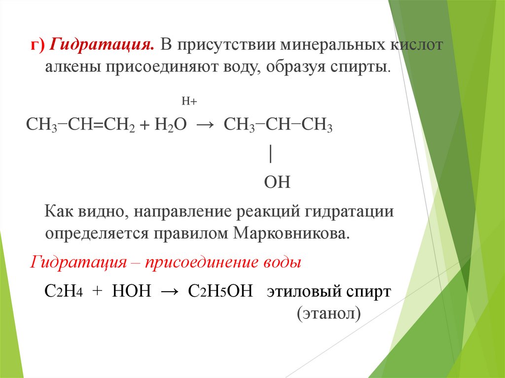 г) Гидратация. В присутствии минеральных кислоталкены присоединяют воду, образуя спирты.