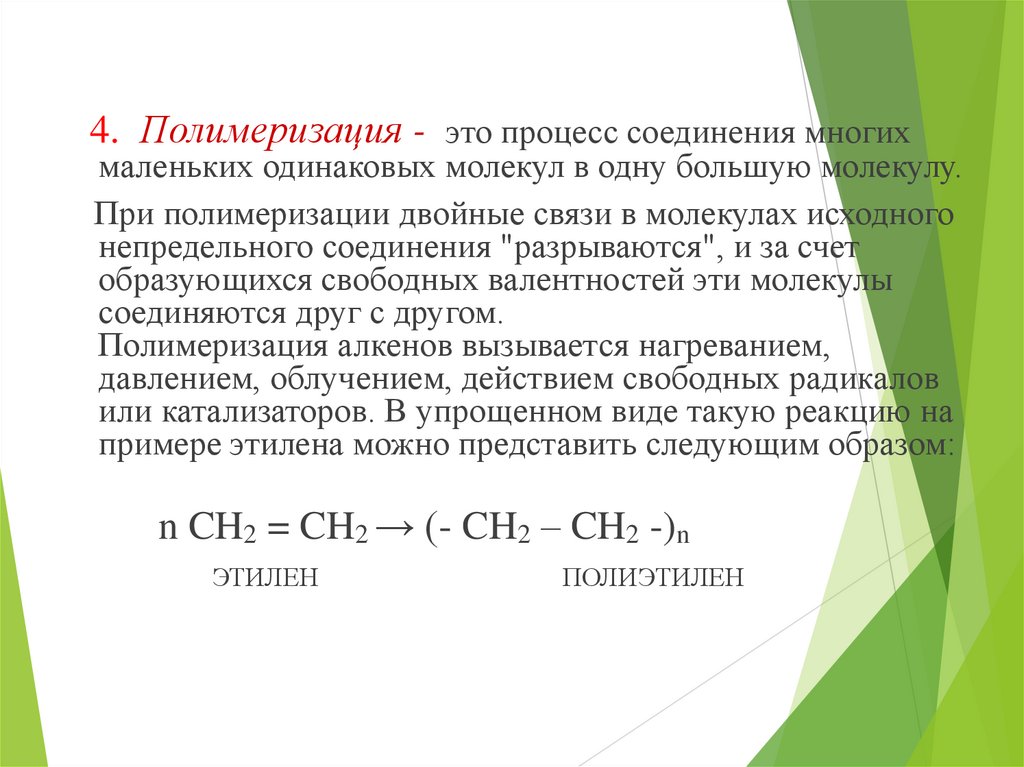 4. Полимеризация - это процесс соединения многихмаленьких одинаковых молекул в одну большую молекулу.