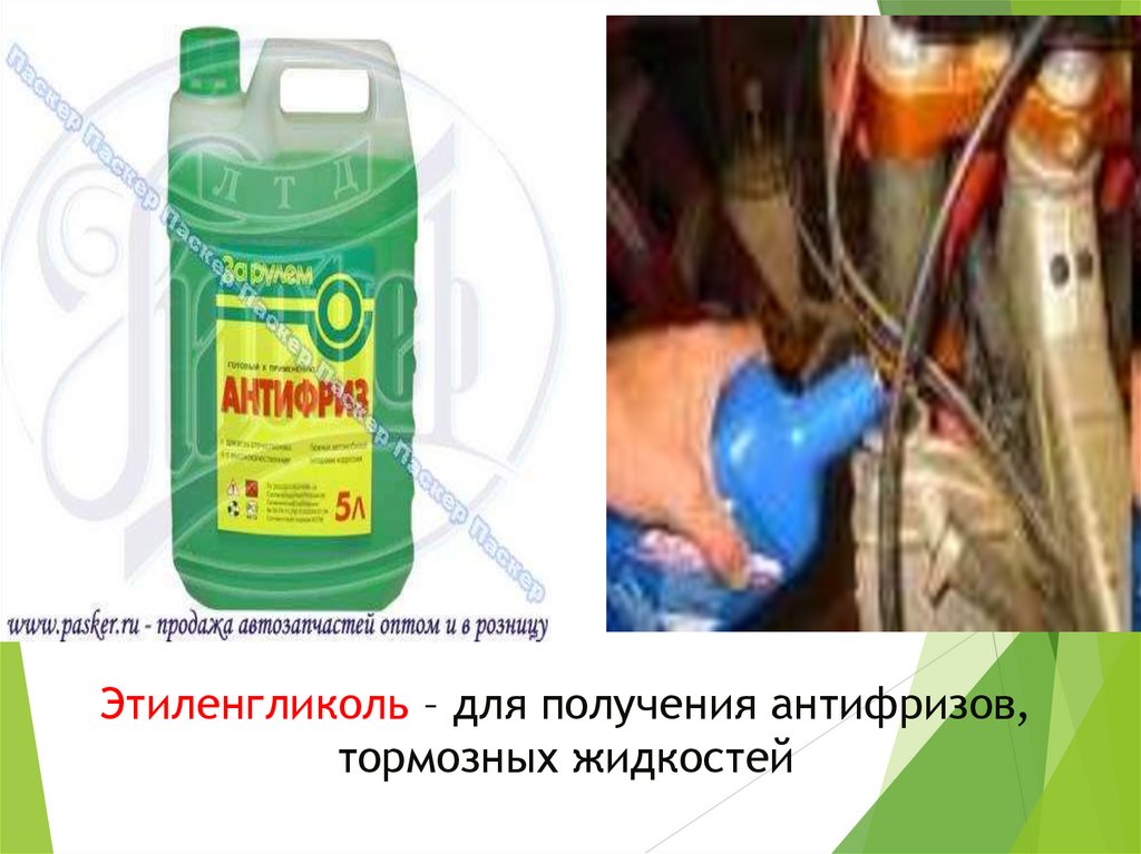 Этиленгликоль – для получения антифризов,тормозных жидкостей