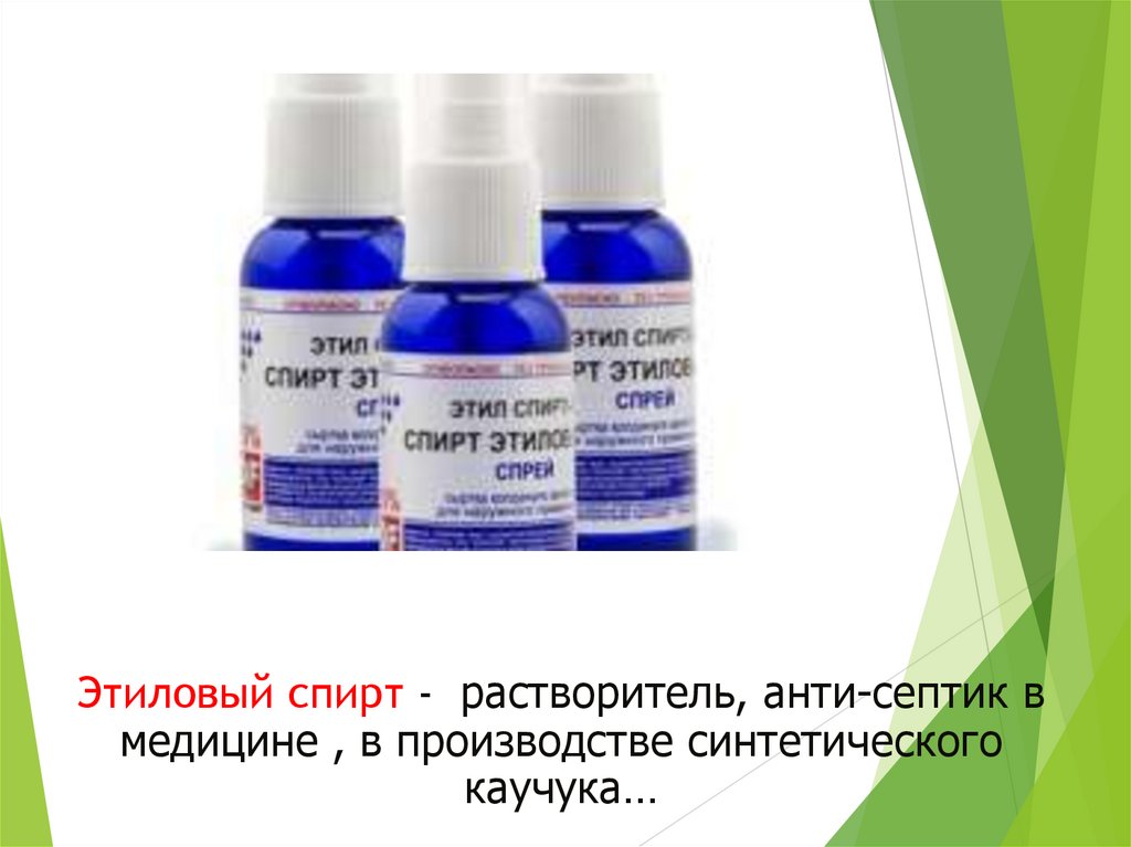 Этиловый спирт - растворитель, анти-септик вмедицине , в производстве синтетического