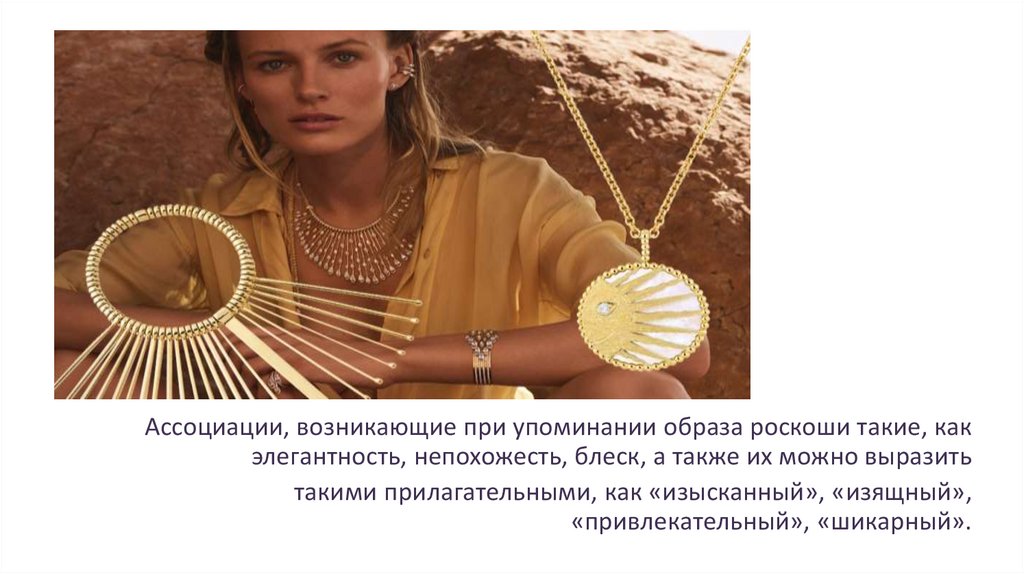 Ассоциации, возникающие при упоминании образа роскоши такие, какэлегантность, непохожесть, блеск, а также их можно выразить