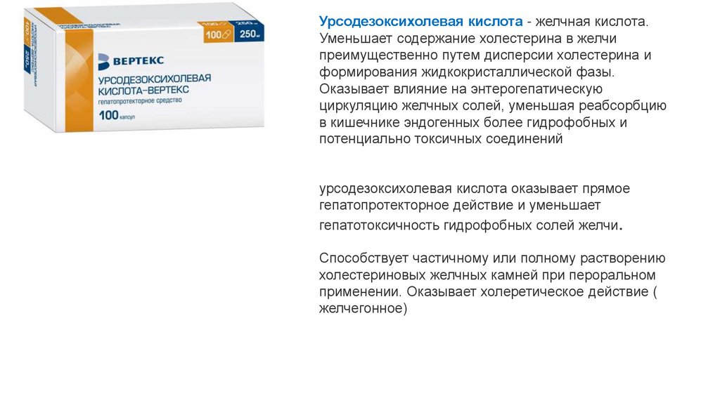 Урсодезоксихолевая кислота - желчная кислота.Уменьшает содержание холестерина в желчи