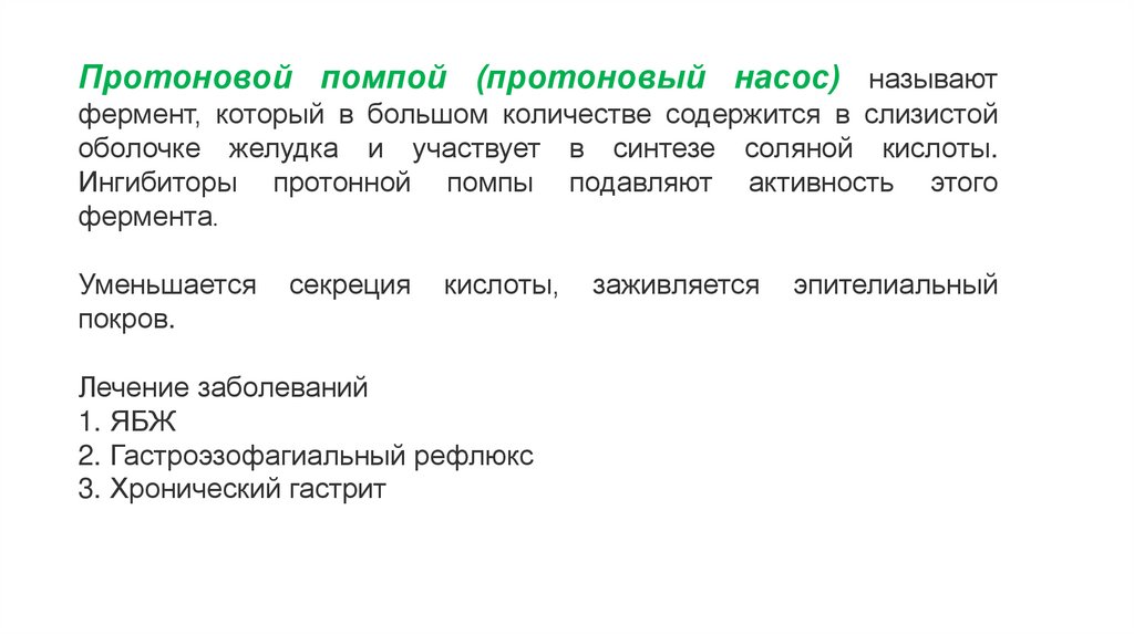 Протоновой помпой (протоновый насос) называютфермент, который в большом количестве содержится в слизистой