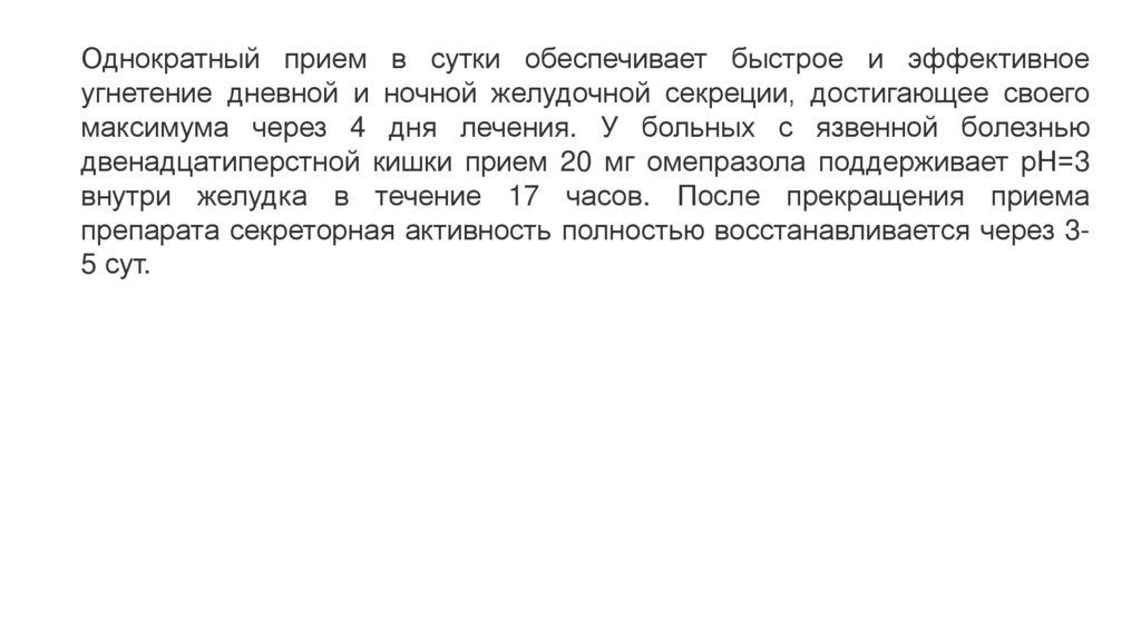Однократный прием в сутки обеспечивает быстрое и эффективноеугнетение дневной и ночной желудочной секреции, достигающее своего