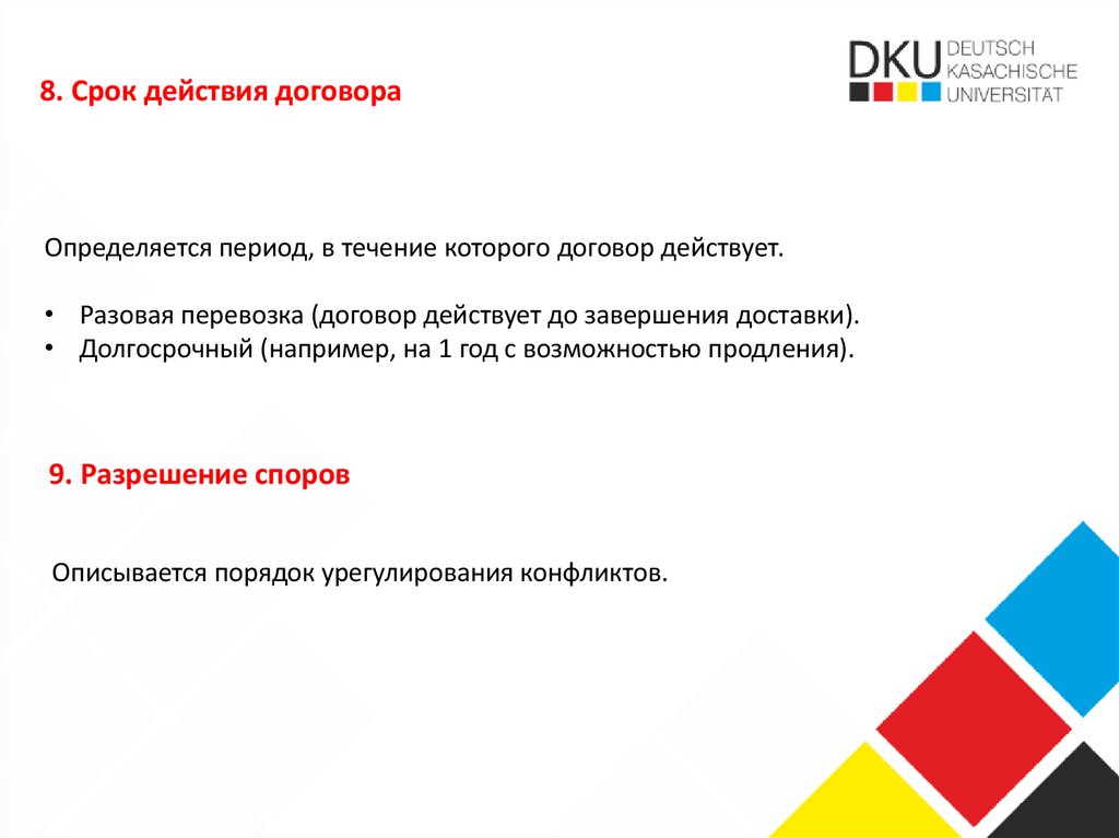 8. Срок действия договораОпределяется период, в течение которого договор действует.