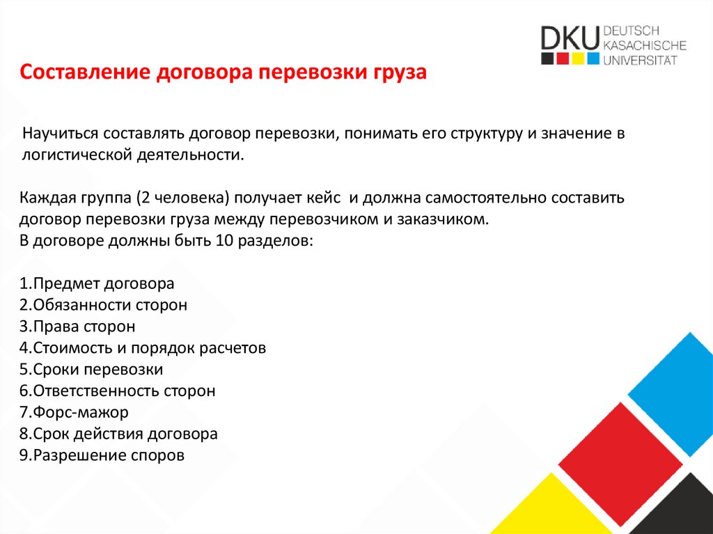 Составление договора перевозки грузаНаучиться составлять договор перевозки, понимать его структуру и значение в