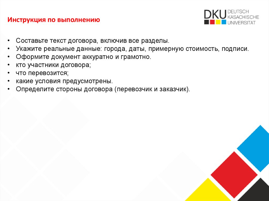 Инструкция по выполнениюСоставьте текст договора, включив все разделы.