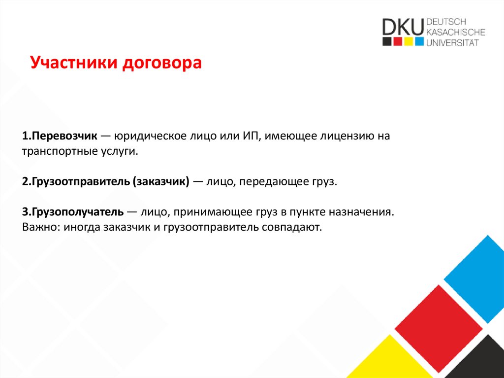 Участники договора1.Перевозчик — юридическое лицо или ИП, имеющее лицензию на