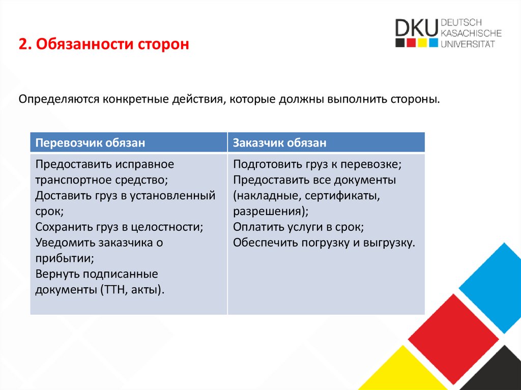 2. Обязанности сторонОпределяются конкретные действия, которые должны выполнить стороны.