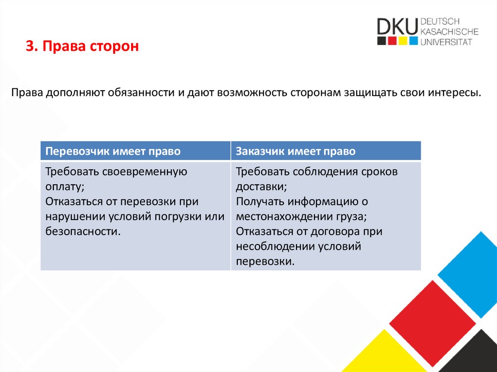 3. Права сторонПрава дополняют обязанности и дают возможность сторонам защищать свои интересы.