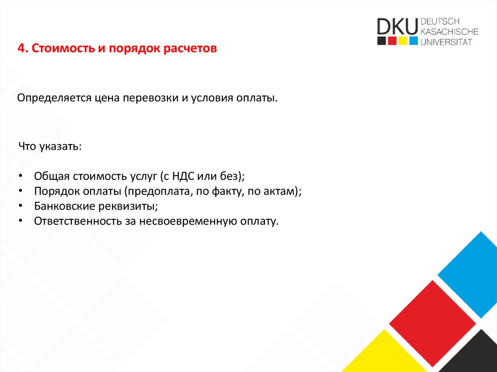 4. Стоимость и порядок расчетовОпределяется цена перевозки и условия оплаты.