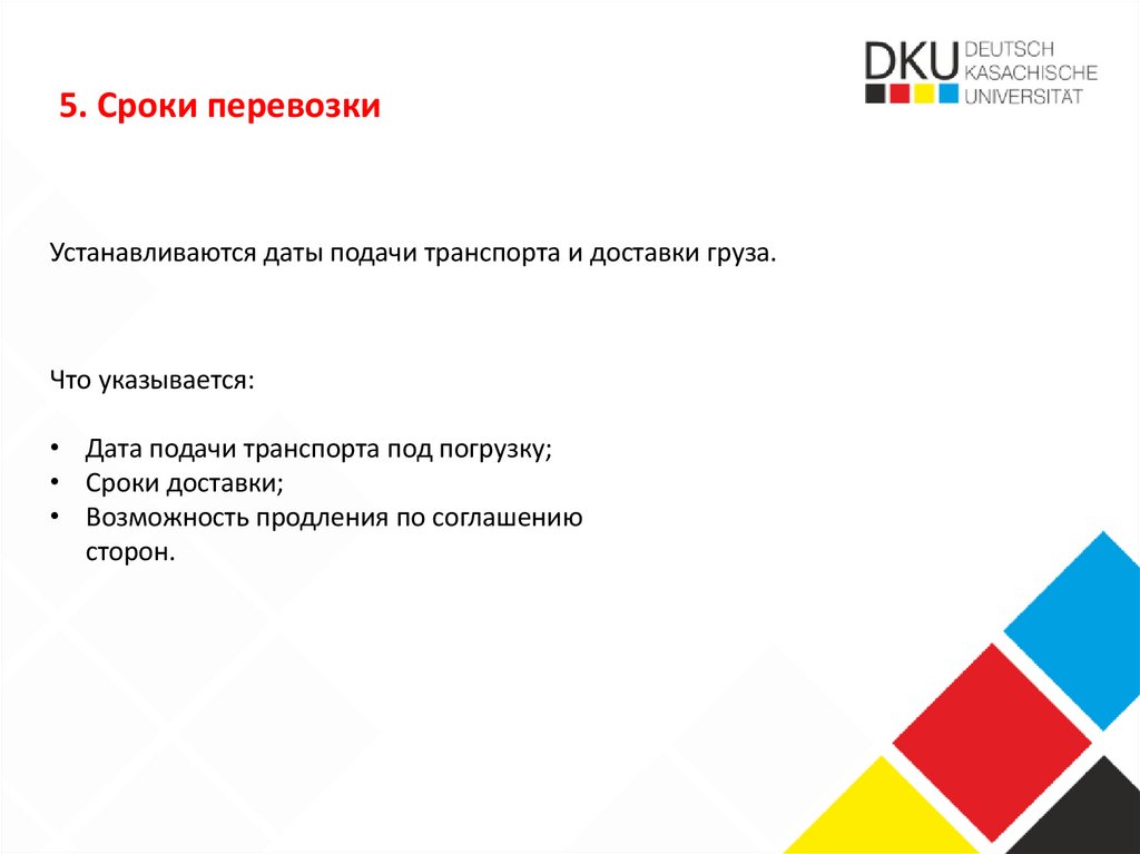 5. Сроки перевозкиУстанавливаются даты подачи транспорта и доставки груза.