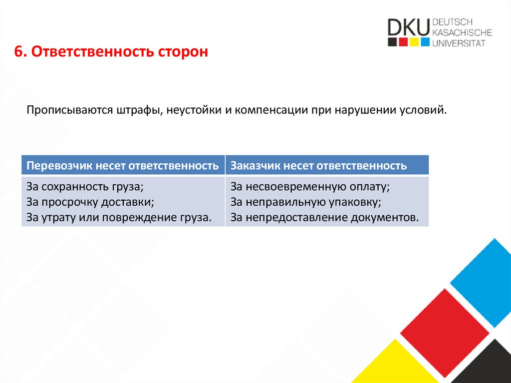 4. Ответственность за повреждение груза — конкретно определить сумму