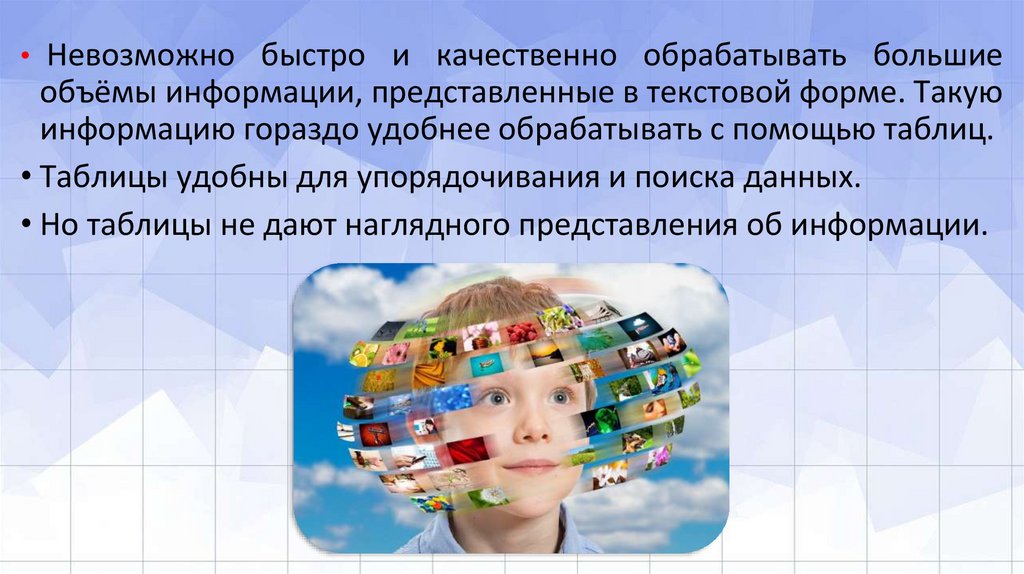 • Невозможно быстро и качественно обрабатывать большиеобъёмы информации, представленные в текстовой форме. Такую