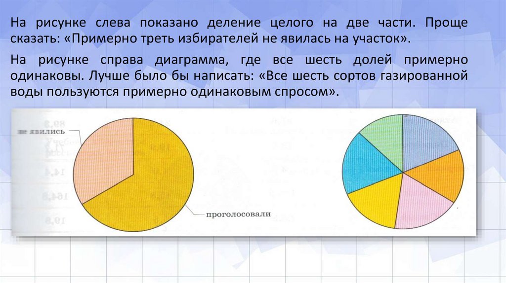 На рисунке слева показано деление целого на две части. Прощесказать: «Примерно треть избирателей не явилась на участок».