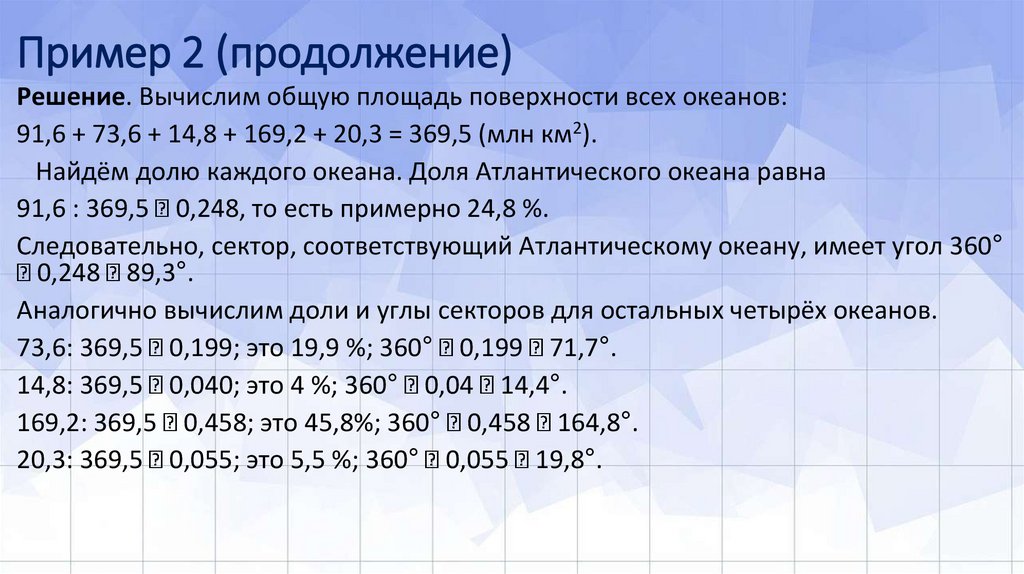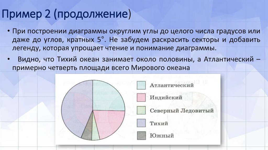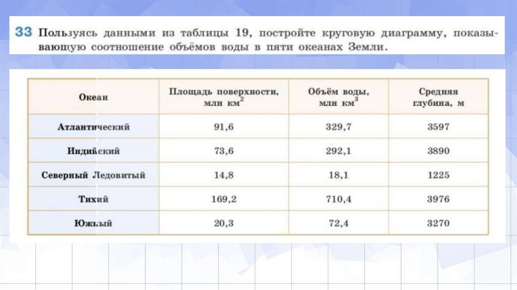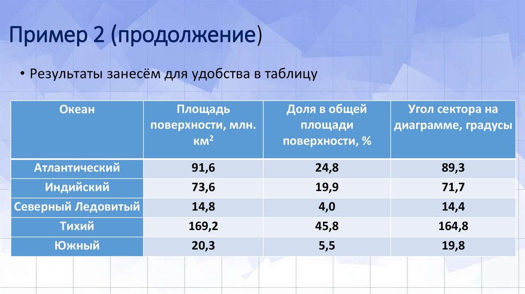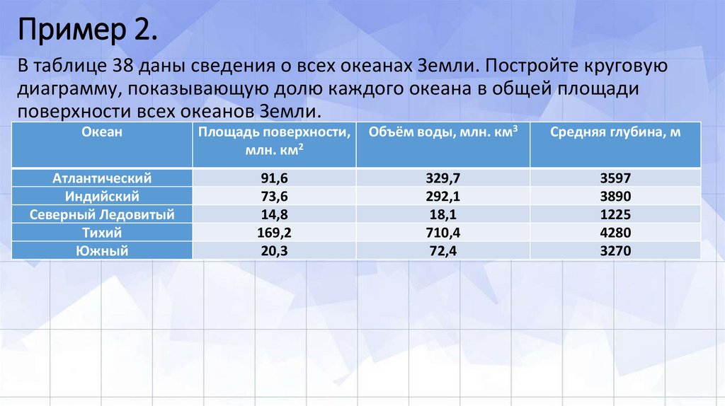 Пример 2.В таблице 38 даны сведения о всех океанах Земли. Постройте круговую