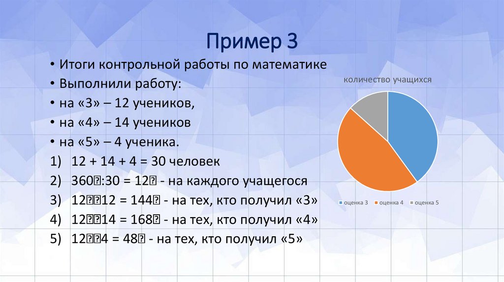 Пример 2 (продолжение)• При построении диаграммы округлим углы до целого числа градусов или