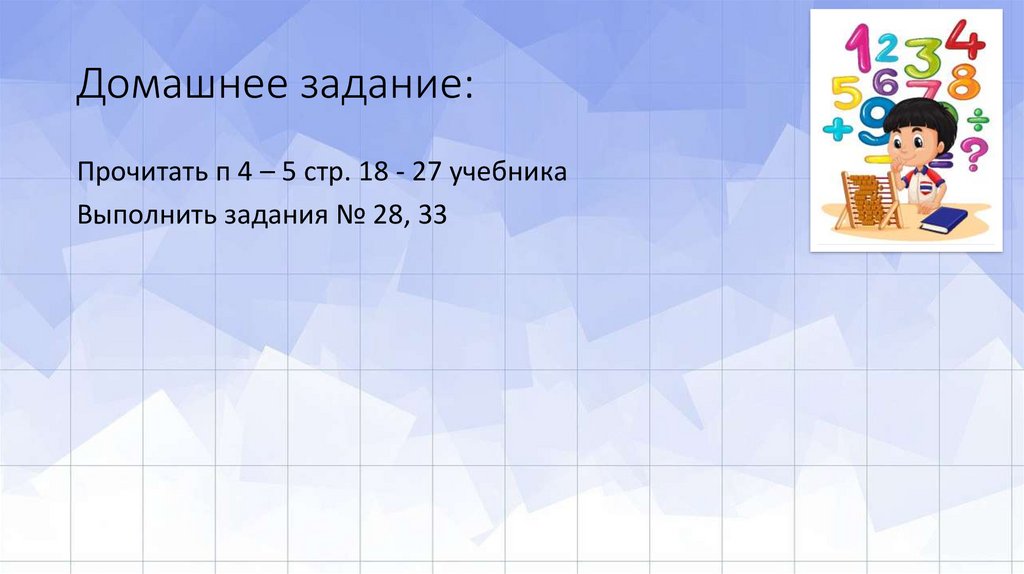Домашнее задание:Прочитать п 4 – 5 стр. 18 - 27 учебника