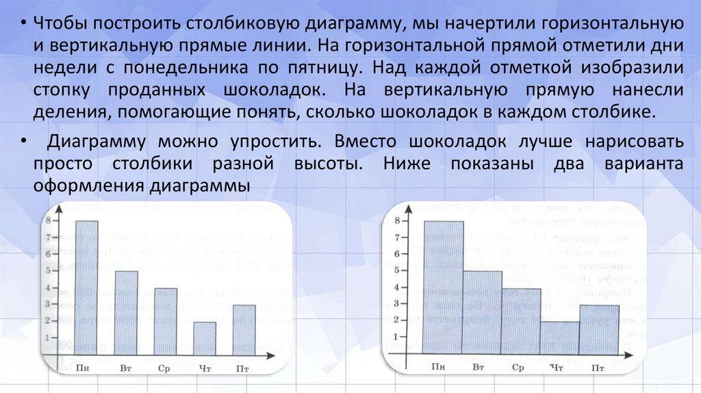 • Диаграмму можно упростить. Вместо шоколадок лучше нарисовать