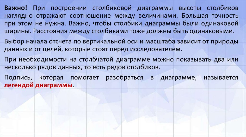 Важно! При построении столбиковой диаграммы высоты столбиковнаглядно отражают соотношение между величинами. Большая точность