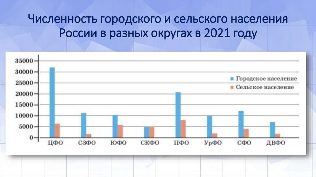Численность городского и сельского населенияРоссии в разных округах в 2021 году