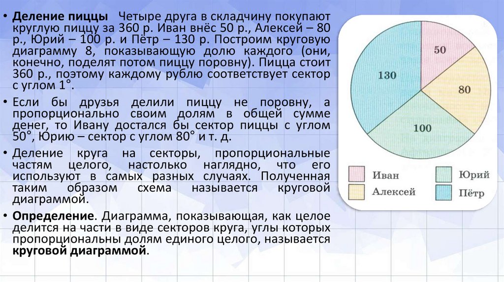 • Деление пиццы Четыре друга в складчину покупаюткруглую пиццу за 360 р. Иван внёс 50 р., Алексей – 80