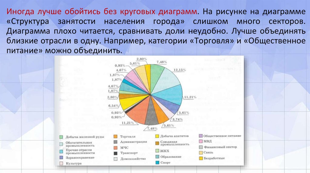 Иногда лучше обойтись без круговых диаграмм. На рисунке на диаграмме«Структура занятости населения города» слишком много секторов.