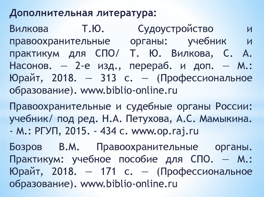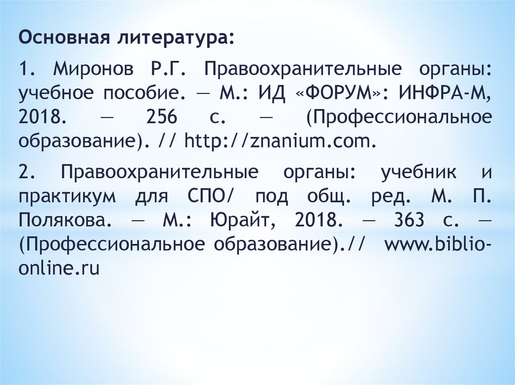 Основная литература:1. Миронов Р.Г. Правоохранительные органы: