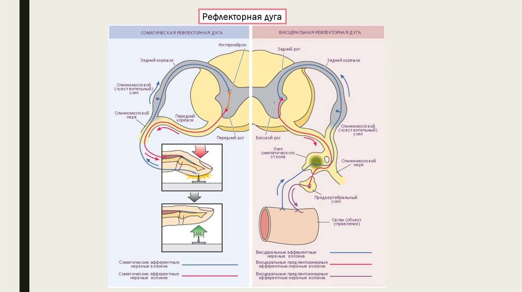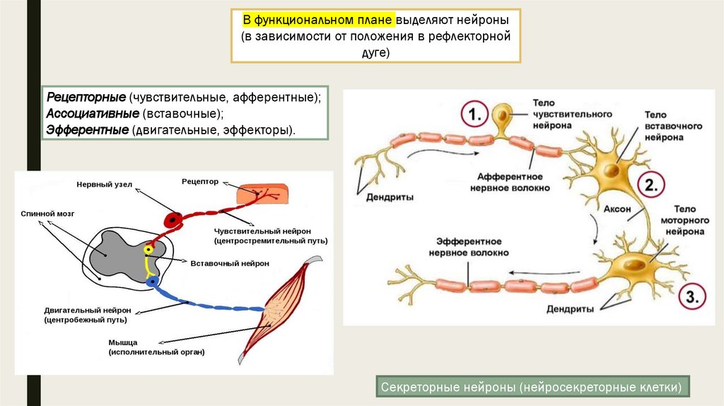В функциональном плане выделяют нейроны(в зависимости от положения в рефлекторной