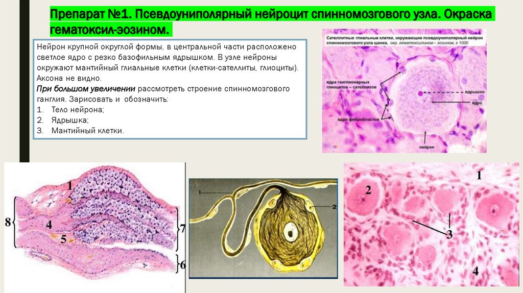 Препарат №1. Псевдоуниполярный нейроцит спинномозгового узла. Окраскагематоксил-эозином.