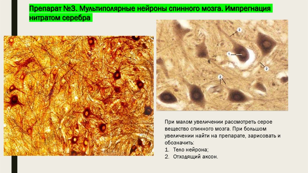 Препарат №3. Мультиполярные нейроны спинного мозга. Импрегнациянитратом серебра