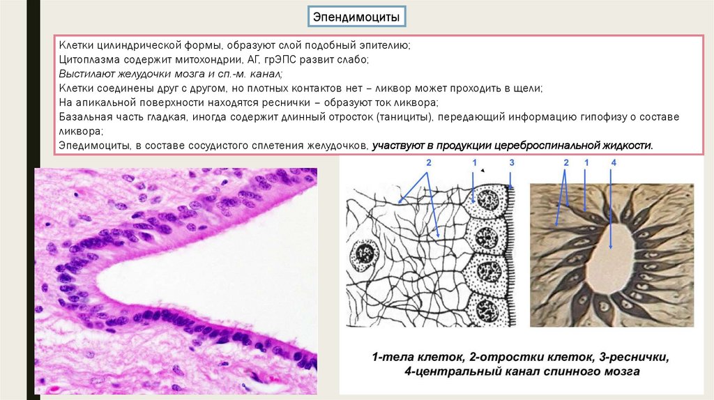 ЭпендимоцитыКлетки цилиндрической формы, образуют слой подобный эпителию;