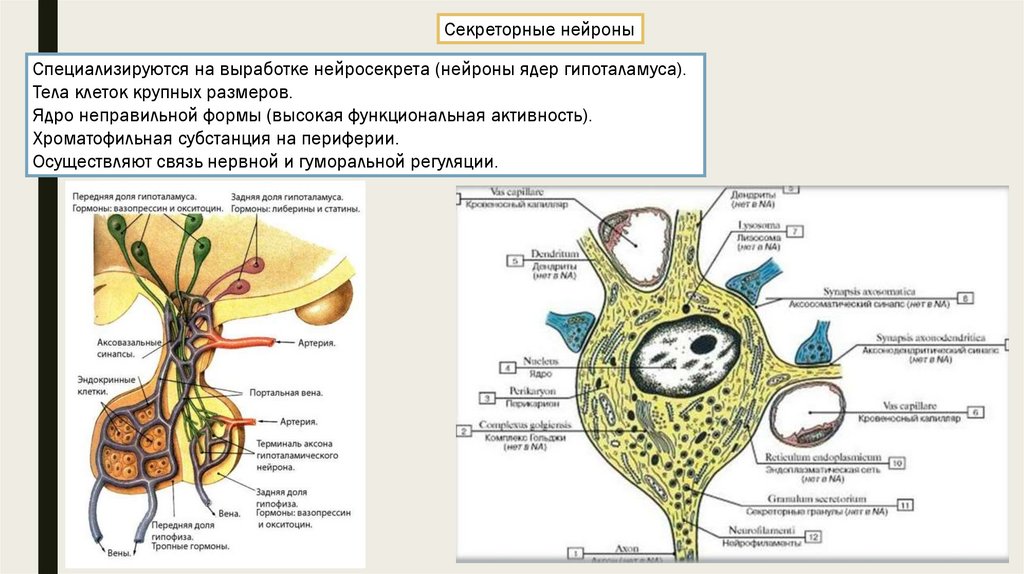 Секреторные нейроныСпециализируются на выработке нейросекрета (нейроны ядер гипоталамуса).
