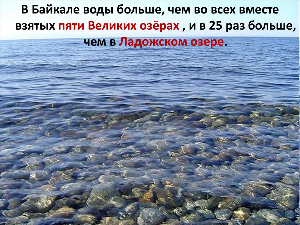 В Байкале воды больше, чем во всех вместевзятых пяти Великих озёрах , и в 25 раз больше,