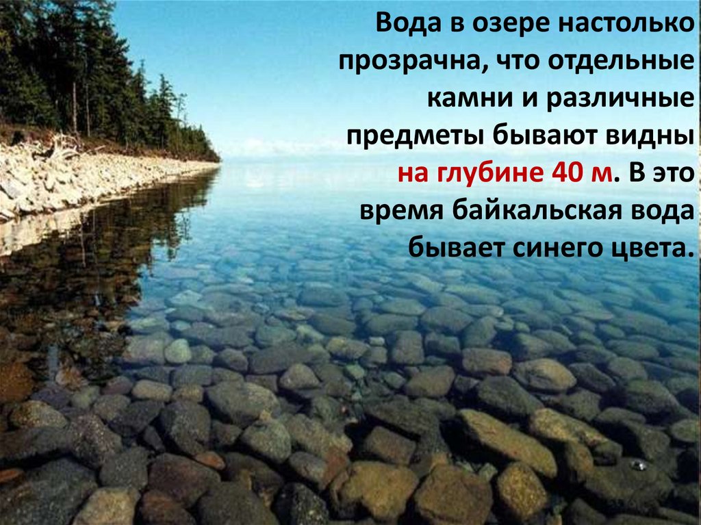 Запасы воды в Байкале гигантские — 23615,39 км³(около 19 % мировых запасов озерной пресной воды).