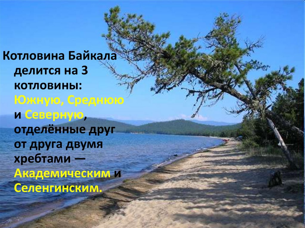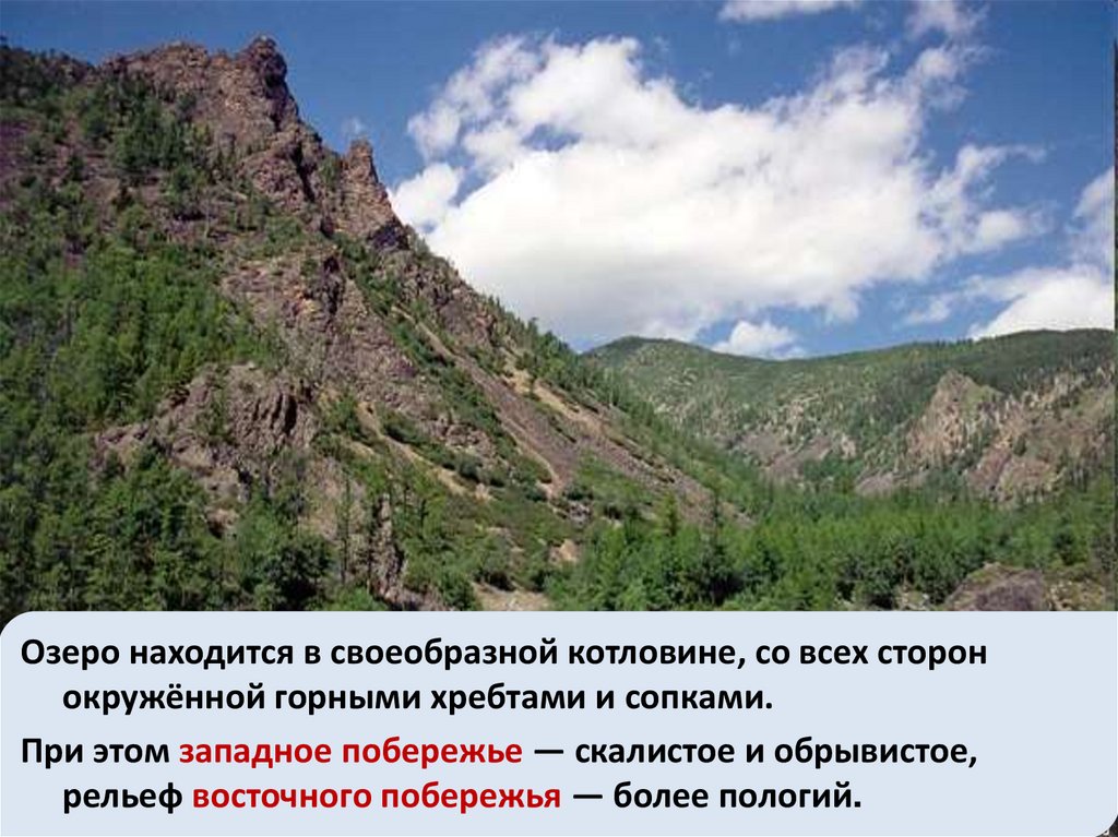Дно Байкала имеет ярко выраженный рельеф. Вдольвсего побережья Байкала в большей или меньшей