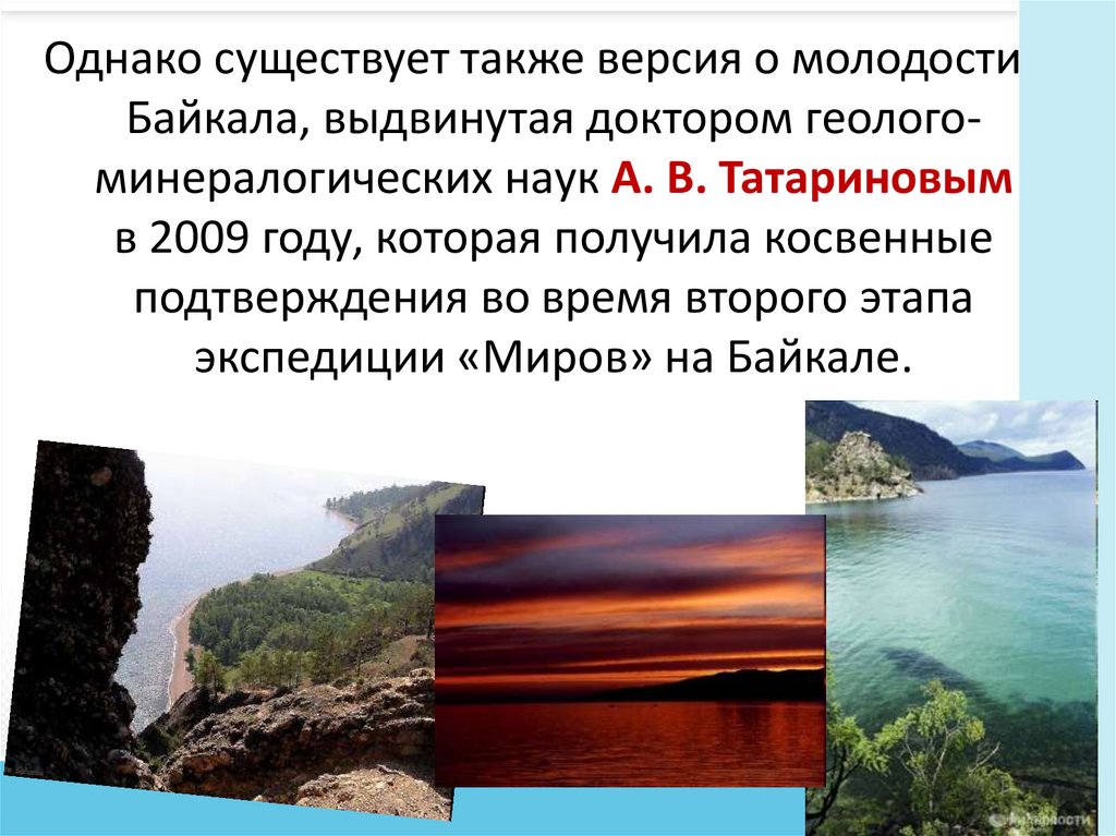Однако существует также версия о молодостиБайкала, выдвинутая доктором геологоминералогических наук А. В. Татариновым