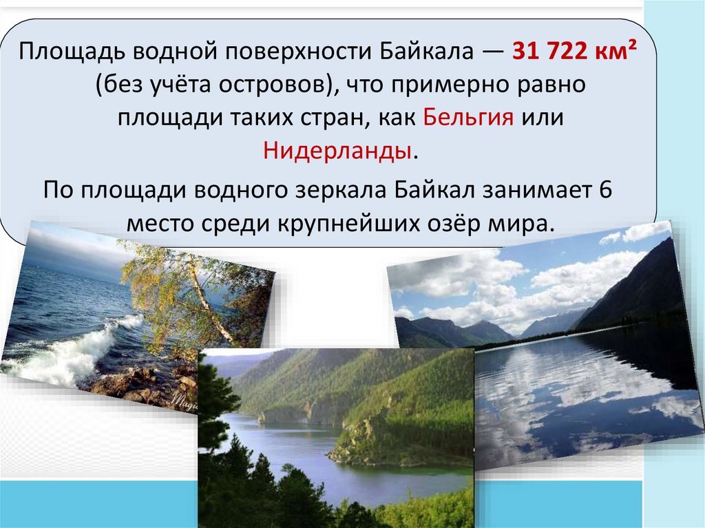 Площадь водной поверхности Байкала — 31 722 км²(без учёта островов), что примерно равно