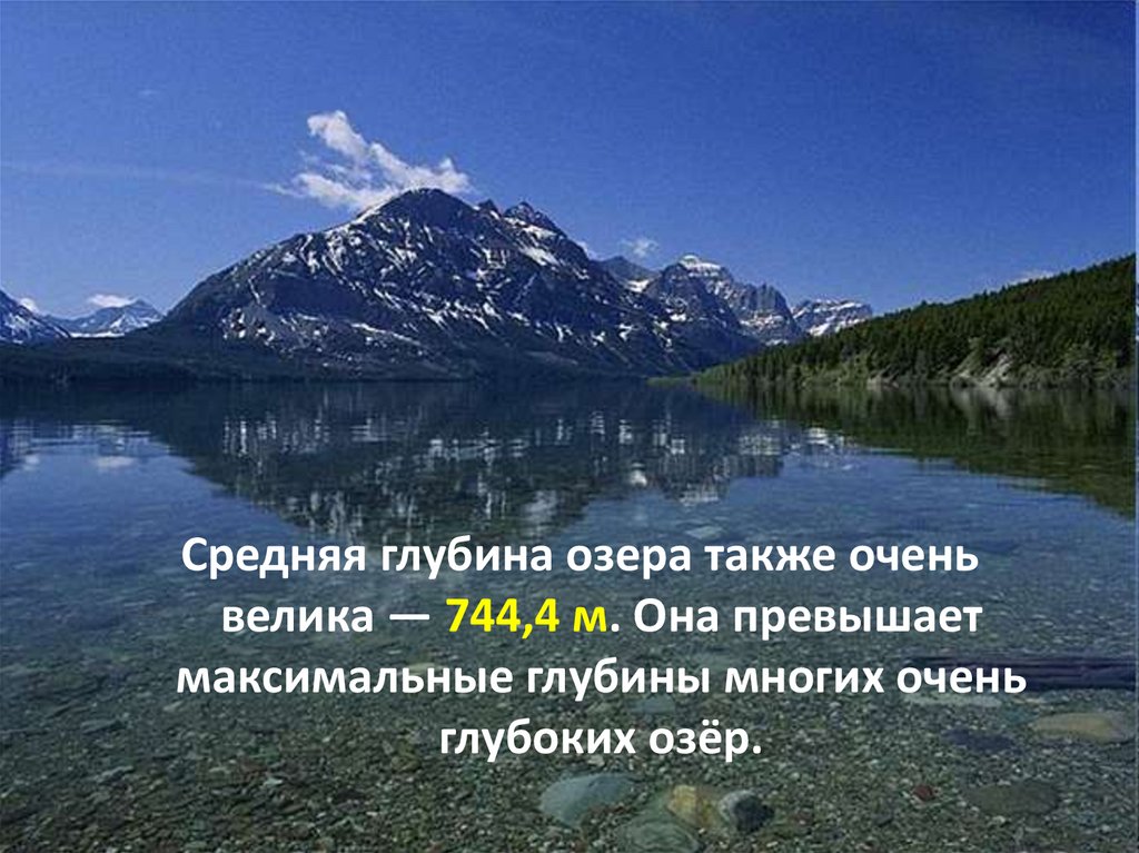 Средняя глубина озера также оченьвелика — 744,4 м. Она превышает