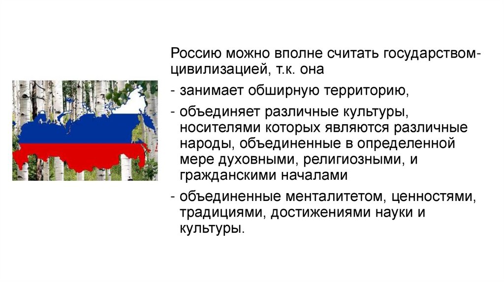 Россию можно вполне считать государствомцивилизацией, т.к. она- занимает обширную территорию,