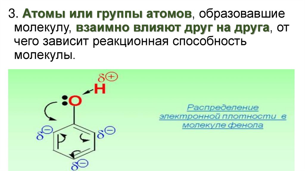 3. Атомы или группы атомов, образовавшиемолекулу, взаимно влияют друг на друга, от