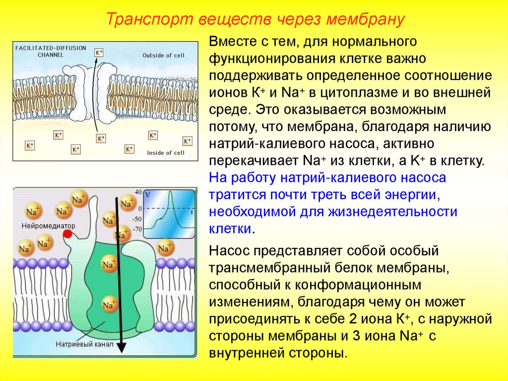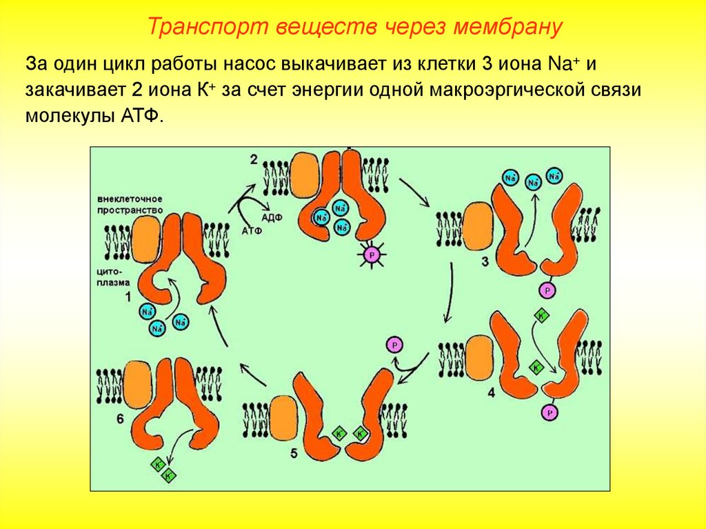 Транспорт веществ через мембрануЗа один цикл работы насос выкачивает из клетки 3 иона Na+ и