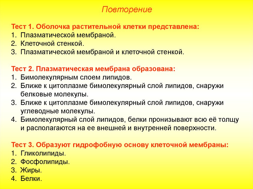 ПовторениеТест 1. Оболочка растительной клетки представлена: